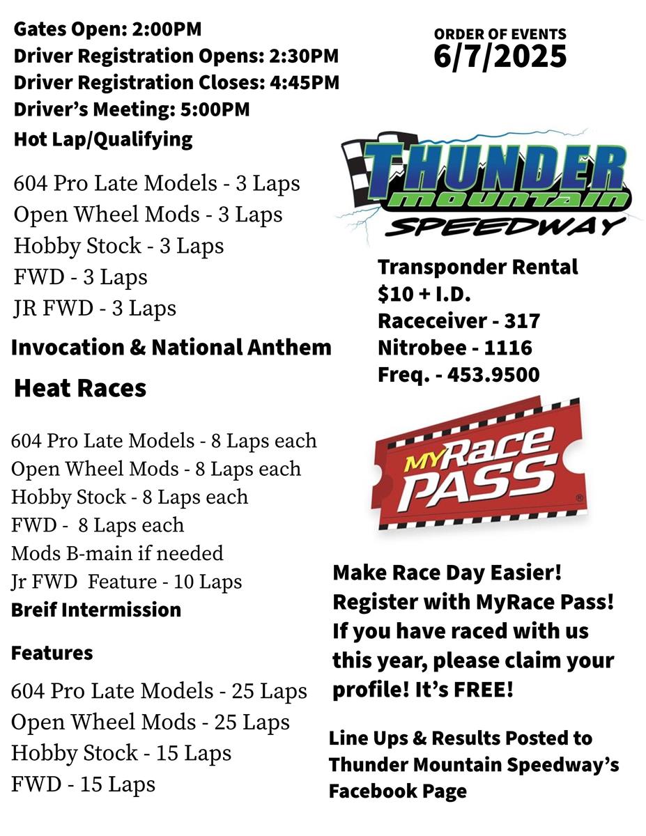 Driver registration will open at 2:30PM and close at 4:45PM. Please have your transponders by 4:45PM. We need to be ready to go in the tower by 5:00PM. Driver's meeting will be promptly at 5:00PM. It will be short and sweet. We will be ready to goo on the track once it concludes. Please have your cars ready and be ready to strap in.