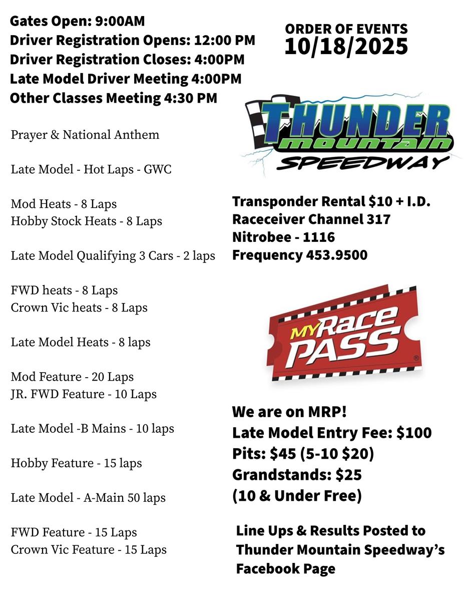 Please be aware of all times on the running order. Please make sure you are registered on time. We will need to have line ups posted by 4:30PM. If you arrive after registration closes, you may have to start at the rear of the heat race. Please be aware of the running order and be ready when it is your time to be on the track. Prayer and National Anthem will be promptly at 5:00PM and straight into the racing program.